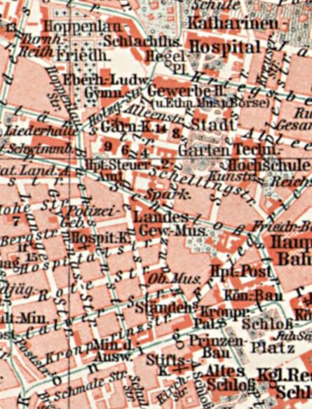 2) daß wegen des Platzes an der Hospitalkirche in Verhandlungen mit der Stadt eingetreten wird, wobei es sich namentlich auch darum handeln wird, ob eine eventuell nötig werdende Ausbuchtung des Trottoirs genehmigt wird.