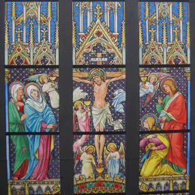 Zum einen sind das die Chorfenster, welche Johann Klein (auch Johannes Evangelist Klein) 1879 geschaffen hatte. Fotos gibt es quasi keine, jedoch haben sich die Entwürfe erhalten, auf "Kartons" bis zu knapp 1m Höhe. Es ist das Verdienst von Isabel Reuter, diese Entwürfe - sie befinden sich in Privatbesitz in der Schweiz - ausfindig gemacht, sie genau untersucht, fotografiert und detailliert beschrieben zu haben. Ihre Masterarbeit hat sie dankenswerterweise zur Verfügung gestellt zur Veröffentlichung auf dieser Website.