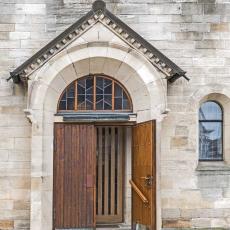 Das Turmfenster wird geschmückt durch das Bild (Wolf-Dieter Kohler) des Erzengels Michael im Kampf mit dem Drachen, der mit seinen zehn Hörnern und sieben Kronen unter den Füßen des Engels liegt. (Offenbarung 12, 7.)