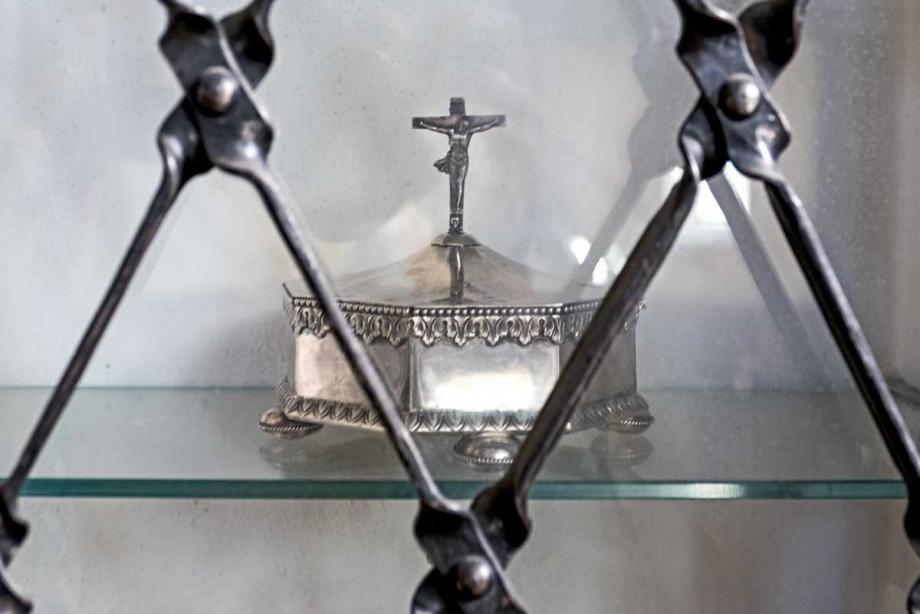 Gegenüber der Kanzel steht in der Wandnische hinter kunstvollem Eisengitter eine besondere Kostbarkeit: der vergoldete Abendmahlskelch aus dem Dreißigjährigen Krieg.