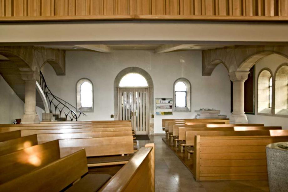 steht auf den Grundmauern der ehemaligen kleinen Dorfkirche und ist deshalb gegenüber dem breit ausladenden Querschiff recht schmal. Das von der einstigen dunklen Bemalung befreite hölzerne Deckengewölbe wirkt in seinem warmen Holzton angenehm und gibt zusammen mit den hellen Wänden, den in der Vierung aufgehängten Leuchten und den Farbfenstern im Chor dem Raum etwas Festliches. Wuchtig ragt die Kanzel vor dem südlichen Querschiffarm und dem Chorbogen herein in den Kirchenraum.