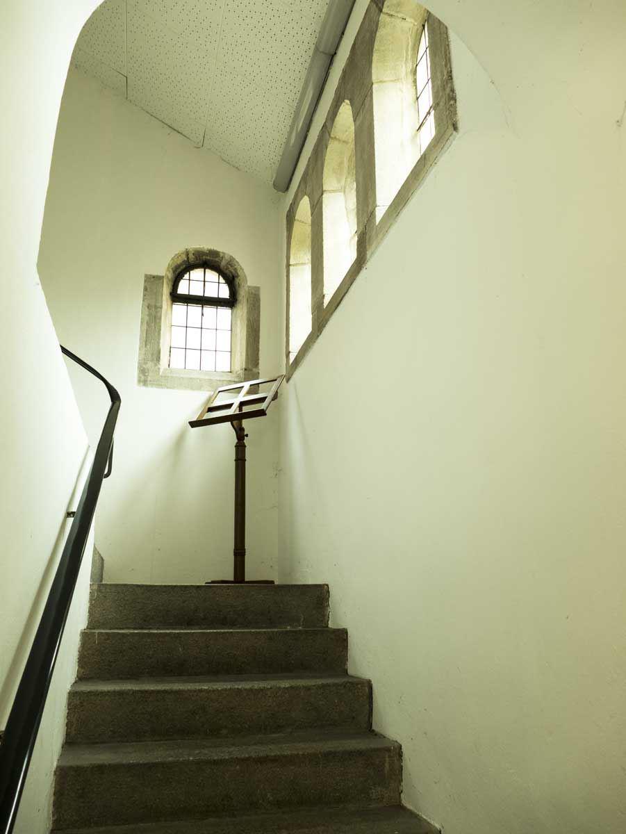 In ihren Tragpfeiler ist unten das Bild vom Fischzug des Petrus eingemeißelt, eine Arbeit des Künstlers Ulrich Henn. Die Geschichte weist mit dem Jesuswort: „Von nun an wirst du Menschen fangen" auf die Bedeutung von Kanzel und Predigt hin.