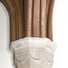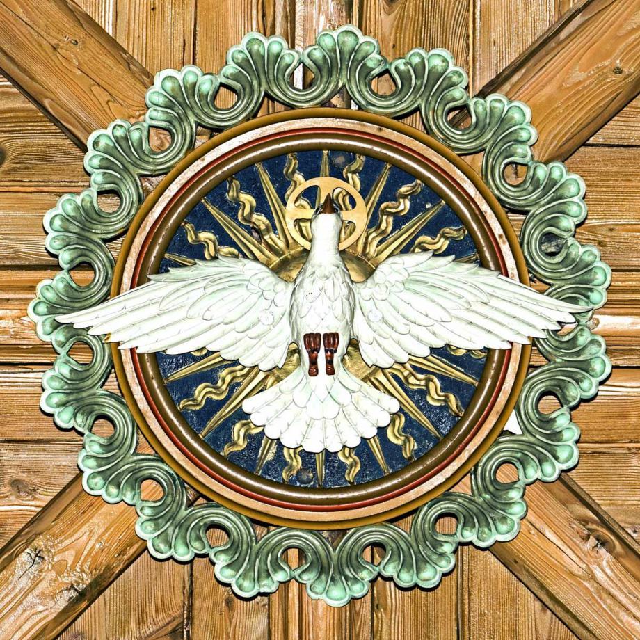 In seine Stirnseite ist der Erzengel Michael geschnitzt. Er steht auf dem besiegten Drachen, in der Linken die Waage des Gerichts haltend, ein Werk des Künstlers Helmut Uhrig.