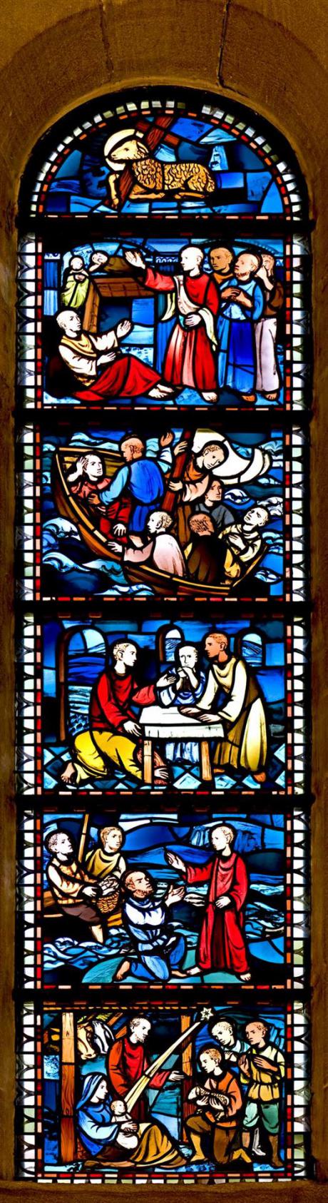 Das linke Fenster in Blau enthält Bilder aus dem Leben Jesu