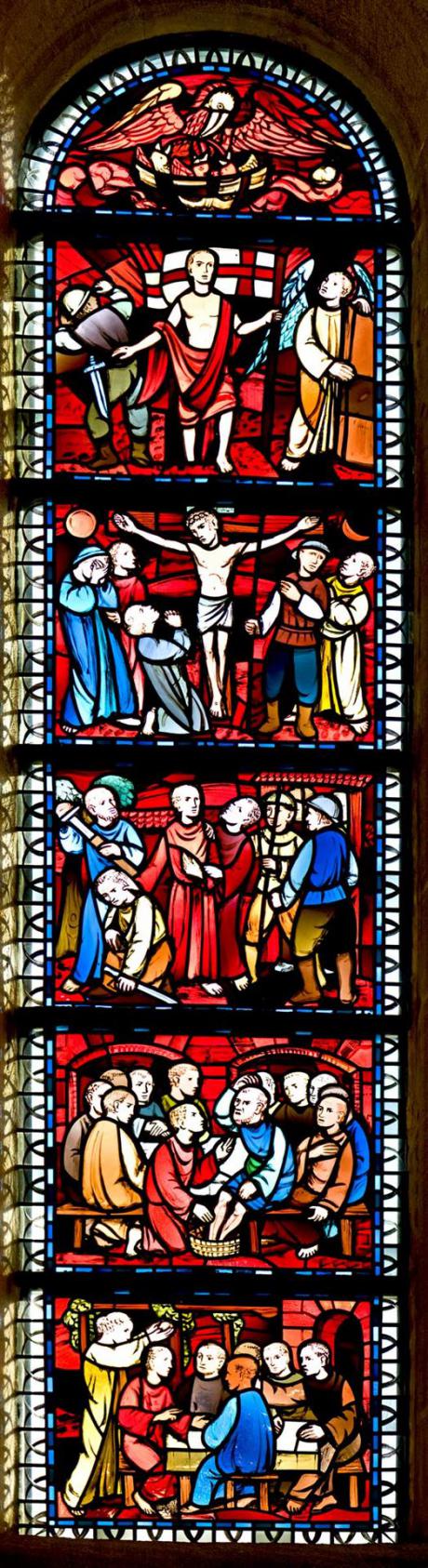Das mittlere Fenster in Rot mit Bildern aus der Leidensgeschichte Jesu