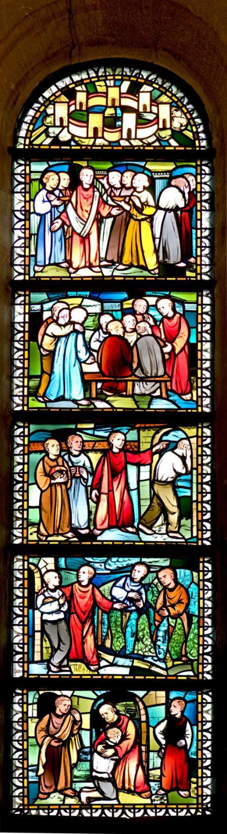 Die drei mittleren Fenster stellen das Lebenswerk Jesu dar, links — beginnend mit der Geburtsgeschichte — seine Wunder und Taten, in der Mitte das Erlösungswerk, rechts seine Predigt in Gleichnissen.