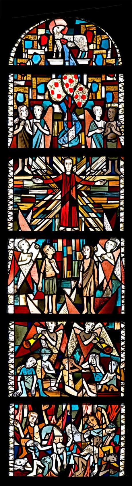 Diese drei Fenster sind im Jahr 1940 und 1941 entstanden, wurden aber erst nach dem Krieg eingebaut. Sie gehören zu den letzten Arbeiten von Walter Kohler.