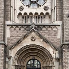 Die gotischen Merkmale sind: der plastische Bauschmuck der Fassade, die Ausbildung von vorgeblendeten Giebeln mit aufgesetzter Palmette bzw. Kreuzblumen über den Portalen und über der 6-teiligen Rosette.