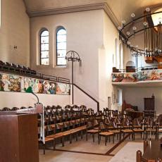 Nach dem Wiederaufbau erhielt die Kirche im Jahre 1956 wieder einen künstlerischen Schwerpunkt: das acht Meter hohe Chorfenster des Stuttgarter Kunstmalers Christian Oehler (* 1909 Bad Cannstatt, + 1986 Netstal /Schweiz) Es ist das erste ungegenständlich konzipierte Betonglasfenster, das für einen kirchlichen Raum geschaffen wurde.