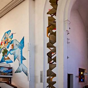Die biblische Schöpfungsgeschichte wird exakt in Bildersprache übersetzt. Trennung von Licht und Finsternis, Himmel und Wasser, Meer und Land. Dann die Schaffung von Pflanzen, Sonne, Mond und Tieren und - ganz zuletzt - vom Menschen und am Ende - als »Krone der Schöpfung« - der Sabbath, das Ausruhen, die Freude Gottes an seinem Werk. Der Künstler hat in die Schöpfungsgeschichte bedrohte Tiere wie Marienkäfer, Elefanten und Libellen eingezeichnet und fordert damit zum gewissenhaften Umgang, zur »Ehrfurcht vor allem Lebendigen« auf.