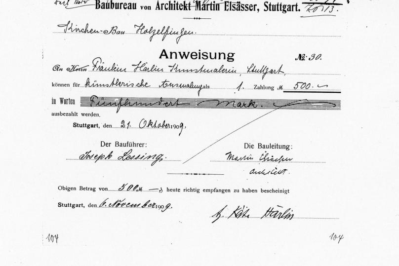 der Architekt erhält Vollmacht die Kunstmalerarbeiten der Frl. Härlin in Stuttgart zu übertragen, nachdem er vorher die Skizzen zur Genehmigung vorgelegt hat. An der Empore sollen wieder die Apostel gemalt werden & am Chorbogen 2 Freskobilder. Taufe & Abendmahl symbolisierend entsprechend der alten Kirche.