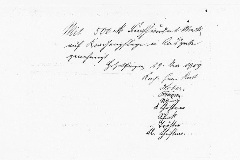 der Vorsitzende wird ermächtigt, dem Musikdirektor Schönhardt Reutlingen für den Erlös aus dem Konzert zu unseren Gunsten im Betrag von 113 M 22 & den herzlichsten Dank auszusprechen, ebenso dem Herrn Adolf Keggelmann Neuyork, einen Vetter des Vorsitzenden, den Dank für seine Gabe mit 100 M.