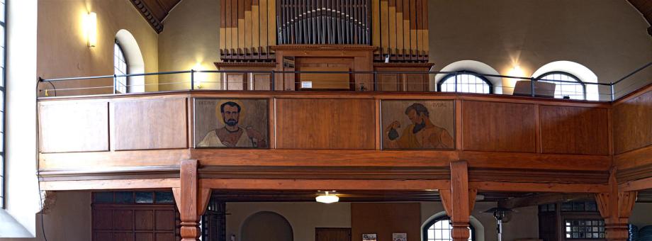 Anders als in den beiden obigen Grundrissen Elsaessers von 1908 wurde die Orgel nicht im Chor der Kirche aufgestellt. Daher entfielen die auf der Orgelempore eingezeichneten Sitzplätze.
