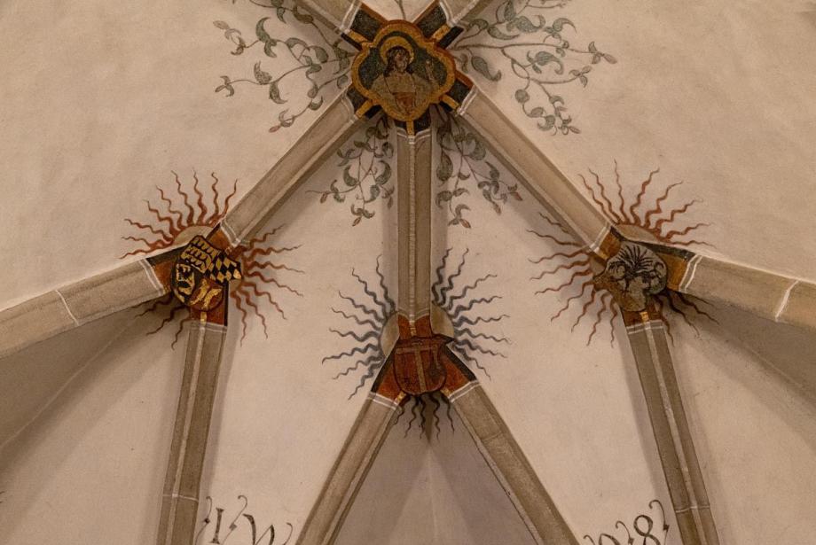 Die Schlusssteine des spätgotischen Chorgewölbes zeigen vorne (über dem Altar) den Ritter Georg mit einem Speer als Drachentöter, dann den Kirchenheiligen Blasius mit Bischofsmütze, Bischofsstab und Abtstab, dann Maria mit dem Jesuskind, das den Reichsapfel in der rechten Hand hält, endlich den erhöhten Christus mit einem Heiligenschein (Nimbus) über dem Dornenkranz.