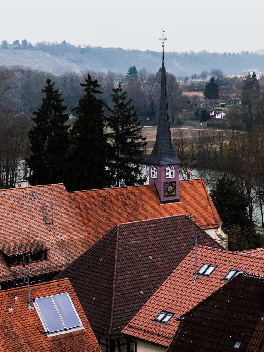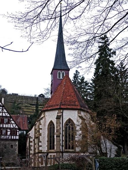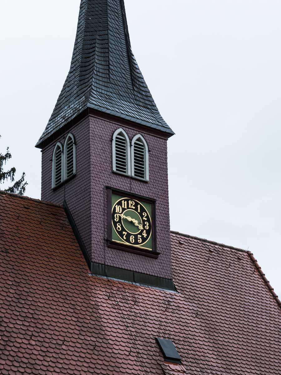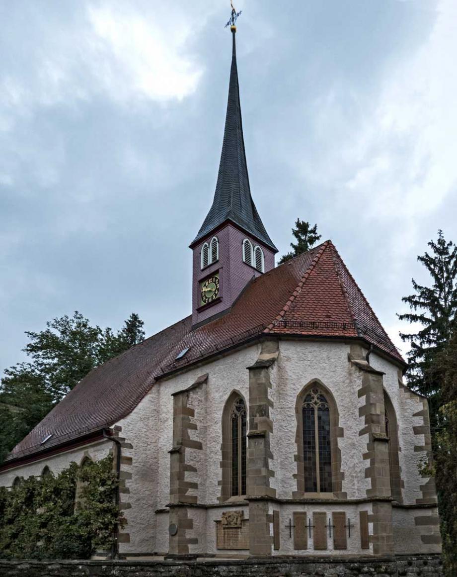 Die WOLFGANGKIRCHE wurde Ende des 15. Jahrhunderts erbaut. Man kann mit ziemlicher Sicherheit sagen, daß die Kirche 1496, als die Pfandschaft der Herren von Speth abgelöst wurde, schon eingeweiht war. Denkbar ist, daß die Kirche am 31 .Oktober 1494, am 500. Todestag von Bischof Wolfgang, geweiht wurde. Da sie eine Filialkirche von Neckarweihingen war, erhielt sie statt eines Turmes nur einen Dachreiter.