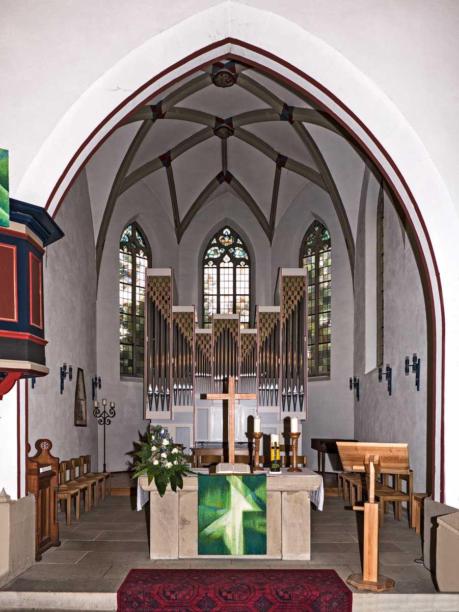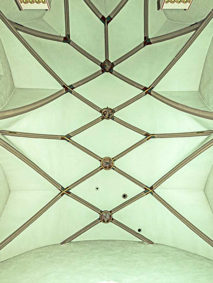 Die vier Schlußsteine des Kreuzrippengewölbes im spätgotischen CHOR zeigen Maria als Himmelskönigin mit dem Jesuskind, Bischof Wolfgang von Regensburg mit Bischofsstab, Beil und der Hohenecker Kirche, das Wappen der damaligen Burgherren (bis 1496) Speth und ein Steinmetzzeichen, das auch im Turm der Alexanderkirche in Marbach zu finden ist.