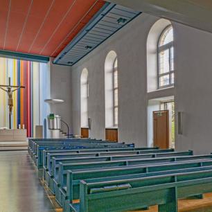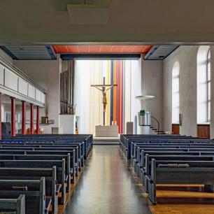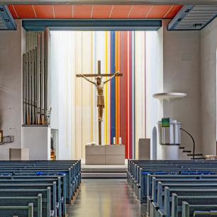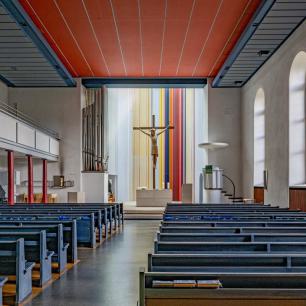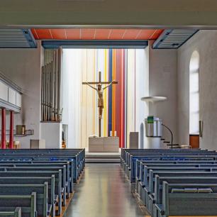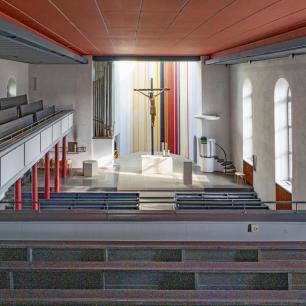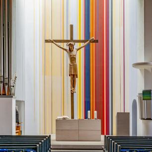 ...Ästhetisch gab es das Bedürfnis nach Beruhigung und Vereinheitlichung des Raumes mit seinen heterogenen Elementen sowie nach Öffnung im Eingangsbereich, liturgisch nach Zurücknahme der starken Ausrichtung an der Passion, nach mehr Spielraum für die Beteiligung von Gemeindegruppen im Gottesdienst und nach einer bewussten Gestaltung eines Taufbereichs. Um farblich neue Akzente zu setzen, wurde der Künstler Bernhard Huber wegen eines Kunstwerks angefragt. Dieser riet jedoch zum Überdenken der gesamten räumlichen Situation und erklärte sich zur Ausarbeitung einer neuen künstlerischen Gesamtkonzeption bereit (ausführender Architekt: Dag Metzger).
