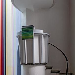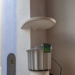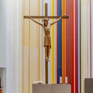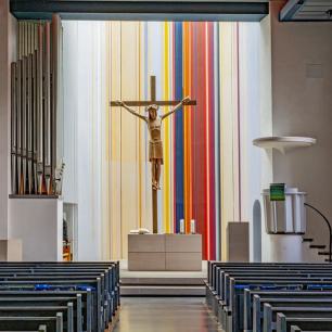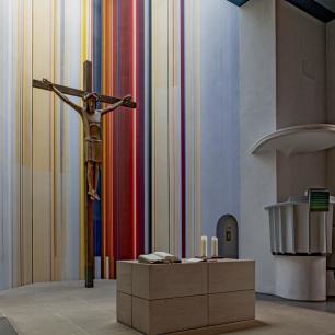 Einen starken Farbakzent setzt dagegen im rechten Bereich ein Muster aus Bändern und Linien. Ursprünglich war die Farbgebung sehr zurückhaltend gedacht gewesen. Doch dem Künstler wurde zunehmend deutlich, dass die Malerei nicht wie eine Tapete wirken dürfe, sondern eine eigene Kraft haben müsse. Mit dem starken Farbakzent sind - im Fluchtpunkt des schrägen Mittelgangs - die Asymmetrie des Raums sowie das gesättigte Rot des Schiffs aufgenommen. Die Malerei wirkt hier wie ein Stück aufgezogener Vorhang des Allerheiligsten. Je länger man die Farbmuster betrachtet, desto mehr bringen sie den gesamten Chorraum zum Schwingen, runden seinen etwas schematischen Grundriss ab und geben ihm eine Tiefenschärfe.