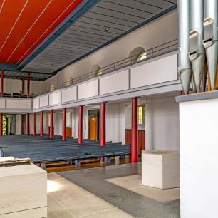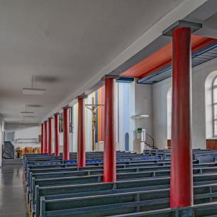 1956 Abbruch der südl. Empore, Choranbau - der Altar wird nach rechts verschoben und vorgezogen, links Einbau der Orgel - Taufstein davor, Kanzel auf die rechte Seite vorne. Zentrales neues Element im Chor der Kruzifixus von Karl Hemmeter. Mittelgang im Schiff verläuft leicht diametral.