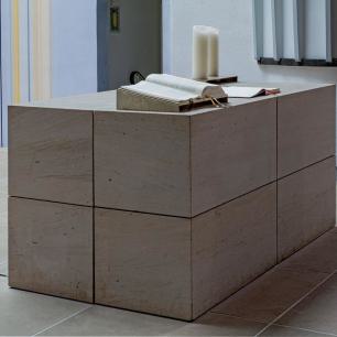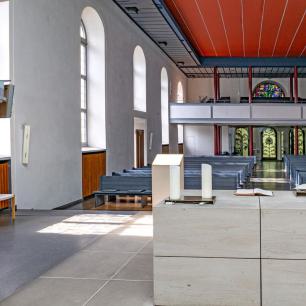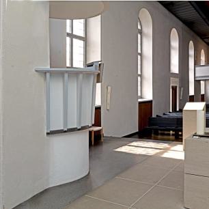 Altar, Ambo und Taufstein behaupten sich in diesem erweiterten Raum in ihrer einfachen, kompakten Gestaltung und Materialität. Die acht Blöcke des Altars lassen von allen Seiten eine Kreuzstruktur erscheinen. Durch die Vorverlegung des Altars ergibt sich nun im Chor zwischen Altar und Kreuz ein Feierraum für kleine Gruppen. Auch der Taufstein kann sich jetzt besser behaupten und bestimmt für Tauffeiern einen eigenen, leicht hervorgehobenen Raum; die Form des Plattenbelags nimmt die Form des Altarbereichs auf. Das Sechseck des Taufsteins wird noch lesbar als Reflex der achteckigen Form von Baptisterien. Der Stein gibt in seiner Form die Struktur des Chorraums wieder, der wie ein angeschnittenes Sechseck wirkt. Während am Altar auf Paramente verzichtet wurde, wurden für die Kanzel neue Paramente geschaffen..."