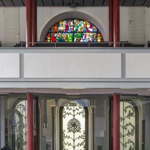 Das Kunstwerk mußte beim Umbau in das halbrunde Fenster über dem Haupteingang verlegt werden, wo es von der Empore aus gut sichtbar ist und bei Abendgottesdiensten, wenn das Licht in der Kirche brennt, von außen zu einer guten Wirkung kommt. Es zeigt vier Szenen aus der Geburtsgeschichte unseres Heilands: Seine Geburt, die Anbetung der drei Weisen aus dem Morgenland, den Kindermord in Bethlehem und die Flucht nach Ägypten. ...