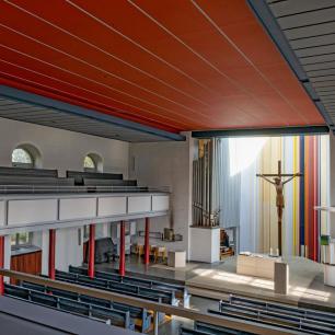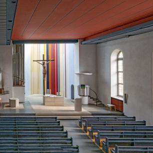 Die Grundidee der neuen Konzeption ist der Lichteinfall in den Chor von oben durch eine Glasdachkonstruktion. Dadurch ist ein unmittelbarer Bezug nach außen geschaffen. Der Raum nimmt damit teil am Sonnenstand und unterschiedlichen natürlichen Helligkeiten, er atmet sozusagen Licht. Durch den hellen Steinbelag wird der gesamte vordere Bereich des Raums aufgehellt und somit aufgewertet. Unterstrichen und verstärkt wird der Lichteinfall von oben durch die Wandmalerei von Bernhard Huber im Chor mit ihrer senkrechten Linienstruktur. Sie lässt an ein Prisma denken, durch welches sich das unsichtbare Licht in seinem Spektrum entfaltet. Die äußeren Bereiche sind farblich zurückhaltend gestaltet und spiegeln die Immaterialität des Lichts.
