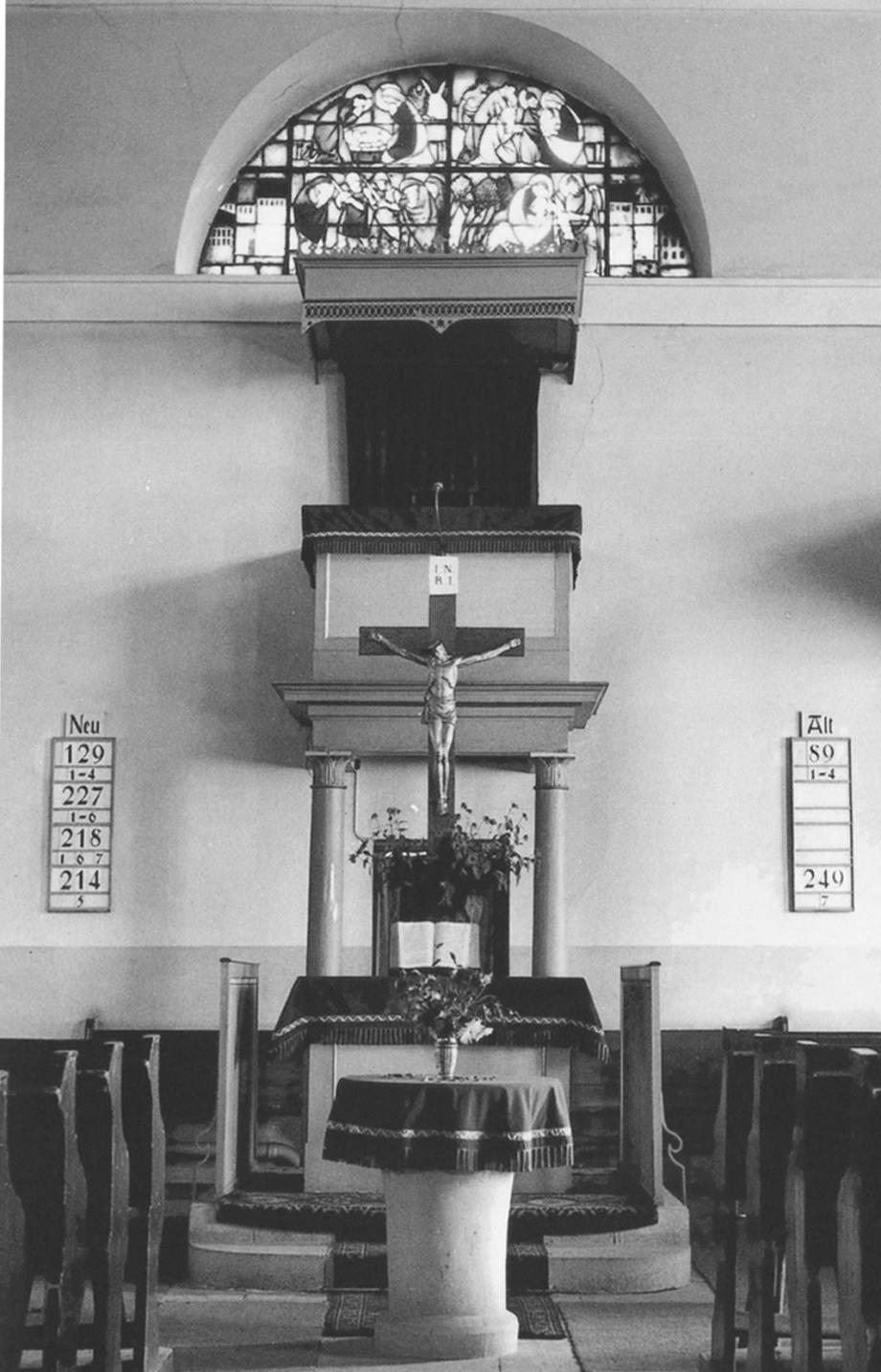 Nach der alten liturgischen Ordnung hätte die Kanzel ihren Platz auf der rechten Seite des Heilands bekommen müssen. Nun brauchte aber die Orgel mehr Raum als auf der linken Seite zur Verfügung stand.... Daher mußten wir von dieser Ordnung abweichen, was deswegen schade ist, weil unser herrliches Kruzifix nicht während des Hauptgottesdienstes von der Morgensonne beleuchtet werden kann, sondern erst im Nachmittagsgottesdienst von der Mittagssonne Licht bekommt.