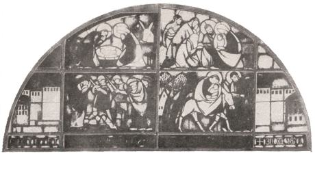 Die Künstlerin hat mit vollem Bedacht die Geburt des Kindleins und die Anbetung der Weisen in den Bogen des halbrunden Fensters hineinkomponiert, um die Enge des Stalls zu zeigen, wobei das Kind, das doch die Hauptperson ist, sich nicht an der höchsten Stelle des Bogens befindet, sondern auf der Seite, wo es so gar »niedrig und gering« zugeht. Der Kindermord und die Flucht sind zwischen die Häuser von Bethlehem hineingestellt; aber geteilt sind diese beiden Bilder durch zwei Bäume — wie wenn sie die Fliehenden schützen wollten. Die Künstlerin hat wohl an die »Christuslegenden« der Selma Lagerlöf gedacht, die von einer Dattelpalme in der Wüste erzählt, die sich vor dem Kind tief herunterbeugt und den Halbverhungerten ihre Früchte reicht.