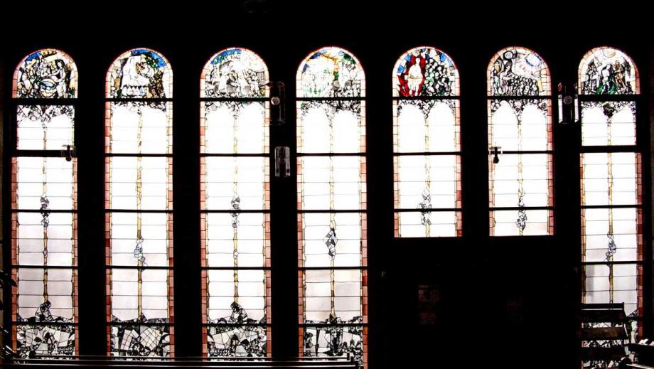 Darunter befindet sich eine Diashow, zunächst die 7 Fenster des AT = sie beginnt bei "Mose erhält die 10 Gebote" bis "Durchzug durch das Rote Meer", danach die 7 Fenster aus dem NT "Jesu Taufe durch Johannes". bis "Jesus bei der Brotvermehrung".