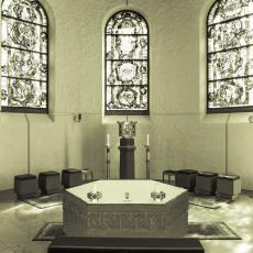 - Ausstattung Chor · Taufstein · Kerzenständer