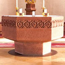 Vorgabe für den Altar war: Ein Kelch aus rotem Buntsandstein, mit Ähren verziert, der aus dem Muschelkalk entsteht. „Wenn das Weizenkorn in die Erde fällt trägt es reiche Frucht.“ Ähnlich sind auch Ambo und Tabernakelstele bearbeitet, hinzu kamen die Sedilien, die Sitzplätze für Pfarrer und Ministranten. Die Materialwahl symbolisiert unsere heimatliche Erdgeschichte, (Buntsandstein und Muschelkalk).