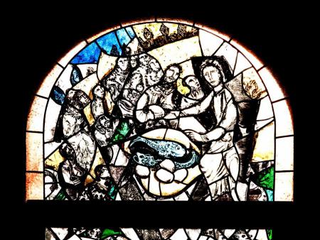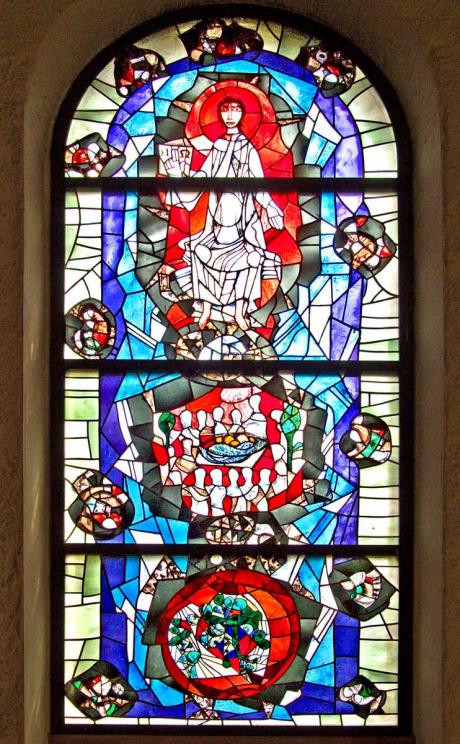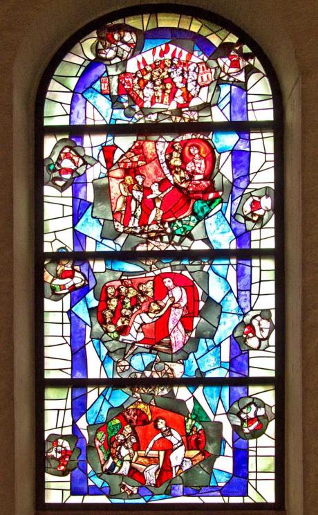 Das Paschafest der Juden im 3. linken Fenster weist hin auf die Erinnerungsfeier an den Auszug aus Ägypten (Ex 12, 1-11).
