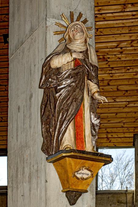 In der Kirche in Ostfildern "begrüßt" der Hl. Dominikus die Besucher - er steht vor der rechten Säule - Blick zu den Eintretenden / Die Hl. Katharina grüßt die Besucher beim Hinausgehen - sie steht vor der linken Säule, dem Altar zugewandt. (s.o. 2.2 Innen Übersicht)