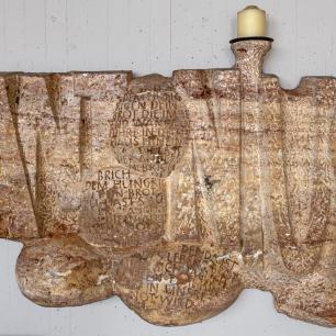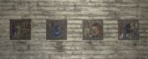 Auf der linken Wand in 4 Segmenten (1 - 3, 4 - 7, 8 - 11, 12 - 15) der Kanon der 14 Stationen ist um eine 15. Station erweitert: Die Frauen am leeren Grab mit dem Engel "Er ist auferstanden"