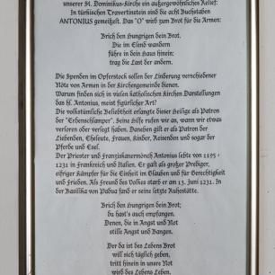 Ein Wunsch der Gemeinde war auch einen Hl. Antonius in der Kirche zu haben. Er steht für die Nächstenliebe und den Einsatz für die Armen. Als Relief in rötlichem türkischem Travertin steht der Name ANTONIUS, mit stilisierten Brotlaiben und Teile des Liedes „Brich den Hungrigen dein Brot“. Geschaffen wurde das Relief 1998 von dem Plieninger Bildhauer Markus Wolf.