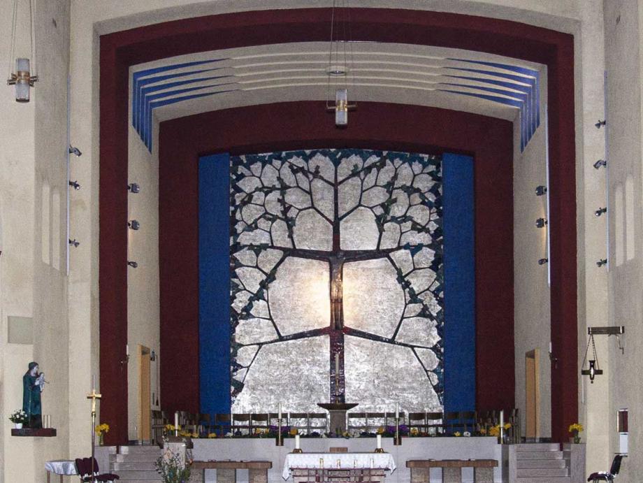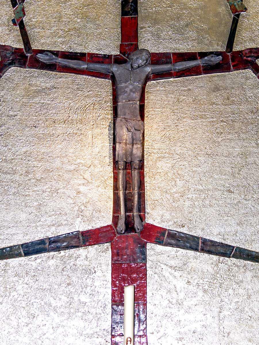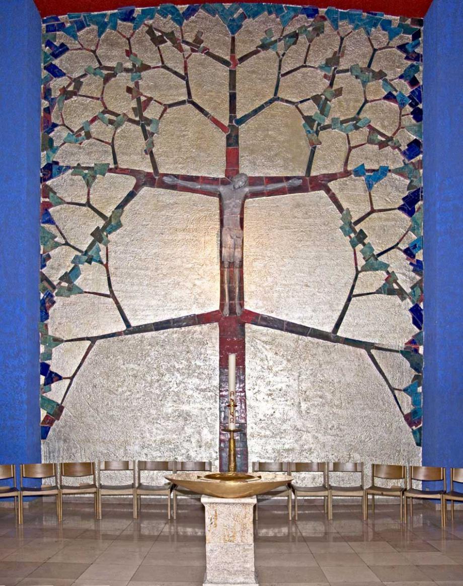 Der Bildhauer Wilhelm Müller (München) bezeichnete die von ihm 1975 geschaffene Keramikarbeit als den „Baum des Lebens". Die frischen Zweige und das grüne Blattwerk, die aus dem toten Holz des Kreuzes sprießen, weisen darauf hin, dass auf den Karfreitag die Auferstehung an Ostern folgt. Die in bescheidenem Habitus gehaltene Muttergottesfigur aus glasierter Terrakotta am linken Mauerpfosten des Chorportals - vermittelnd an der Nahtstelle zwischen Gemeinde und „Christussphäre" postiert – ist ebenfalls eine Arbeit von Wilhelm Müller.