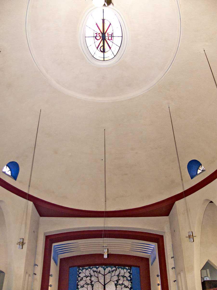 Nicht nur Gestaltungswille, sondern auch das Streben nach guter Ausnutzung des zur Quadratform tendierenden Platzes führte zu einem elliptischen Zentralbau mit Turm und Choranbauten. An der in der Längsachse gegenüber dem Chor befindlichen Nordseite entstand der Portalbau - mit Freitreppe und offenen Portaldurchgängen (Portikus). Die innere Stirnwand nahm über den Türen ein gewaltig dimensioniertes Fresko ein - die Darstellung des Heilandsträgers Christophorus. Der Künstler Alois Schenk (Schwäbisch Gmünd) hatte es - wie auch die Fresken im Kirchenraum - geschaffen..."
