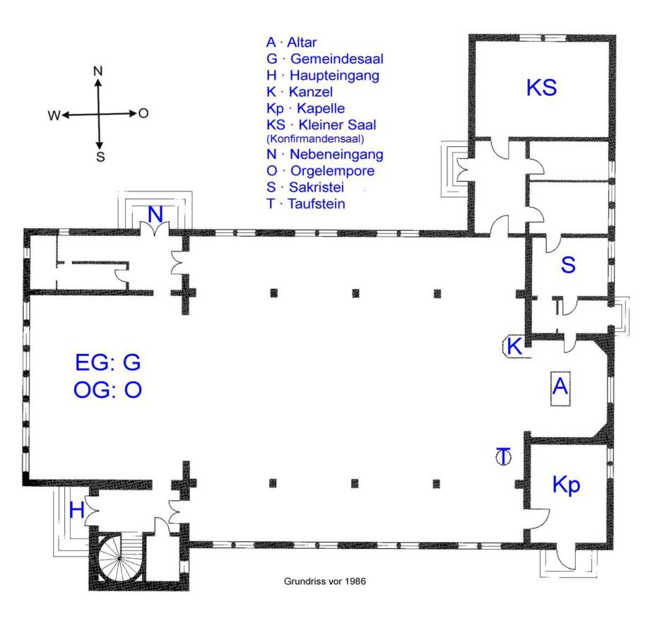 Neu: Küche nördl. des Gemeindesaals; WCs östl. des Wendelsteins |