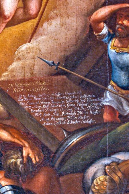 1779. Haben sämtliche Artillerie Verwandte diese bede Taflen Renoviren lassen. Christian Schmid Rothgerber. Jac. Samuel Stepper Peruquier. Friderich Carl Klump Beck. Georg Adam Klett Schumacher. Georg Michael Seeger Seiler. Bernhard Finsinger Chyrurg. Joh. Jac. Friderich-Mez Beck. Joh. Rudolph Müller Kieffer. Jung Alexander Müller Kieffer. Johan Gottlob Schuster Schlosser.