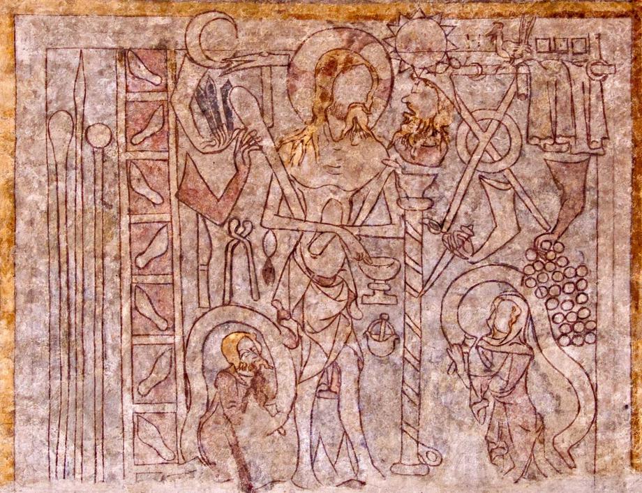 Das älteste erhaltene Stück ist das Wandbild an der Nordwand des Kirchenschiffs, das noch aus dem 14. Jh. stammt und Christus inmitten seiner Marterwerkzeuge darstellt. Die Leidenswerkzeuge Christi kommen bereits in der byzantinischen Kunst vor; wenn auch nur die wichtigsten von ihnen. Infolge wachsender Verehrung der Passion und durch die Überführung von Leidenswerkzeugen als Reliquien nach Europa wurde der liturgische Kult angeregt und gesteigert. Dadurch wurden die ,,Arma" (lat. für Marterwerkzeuge, Waffen) Christi seit dem 14. Jh. besonders in Frankreich und Deutschland ein wichtiges, auch durch Ablässe gefördertes Andachtsmotiv. Um dem Betrachter das ganze grausame Ausmaß der Passion möglichst drastisch vor Augen zu führen, ja um ihn zu schockieren, ihn zur Meditation anzuregen, wurden alle Leiden Christi während seiner gesamten Erdenzeit bildlich erfaßt und dabei die Zahl der Arma wesentlich vermehrt. So werden auf dem Weil der Städter Fresko etwa auch das Messer der Beschneidung, die dreißig Silberlinge des Judas und der Hahn, der bei der dritten Verleugnung Petri krähte, gezeigt, ebenso Fußabdrücke, weil Christus den Kreuzweg barfuß gehen mußte. Interessanterweise muß es im 14. Jh. eine feste Vorstellung hinsichtlich des Aufbaus des Arma-Christi-Bildes gegeben haben. Formal ganz eng verwandte, etwa zeitgleiche Darstellungen des Themas finden sich häufiger, manchmal weit entfernt, so im Franziskanerkreuzgang in Bozen, in Schemmerhofen (Krs. Biberach, Kapelle St. Mauritius), in Scharenstetten und Schelklingen (Alb-Donau-Krs., Kirche bzw. St.-Afra-Kapelle) und in Horb (Liebtrauenkapelle). Erstaunlich ist dies deshalb, weil vor Erfindung der Druckkunst keine gemeinsame vervielfältigte Vorlage vorhanden gewesen sein kann. Die Künstler müssen einander ihr Wissen anders weitergegeben haben.