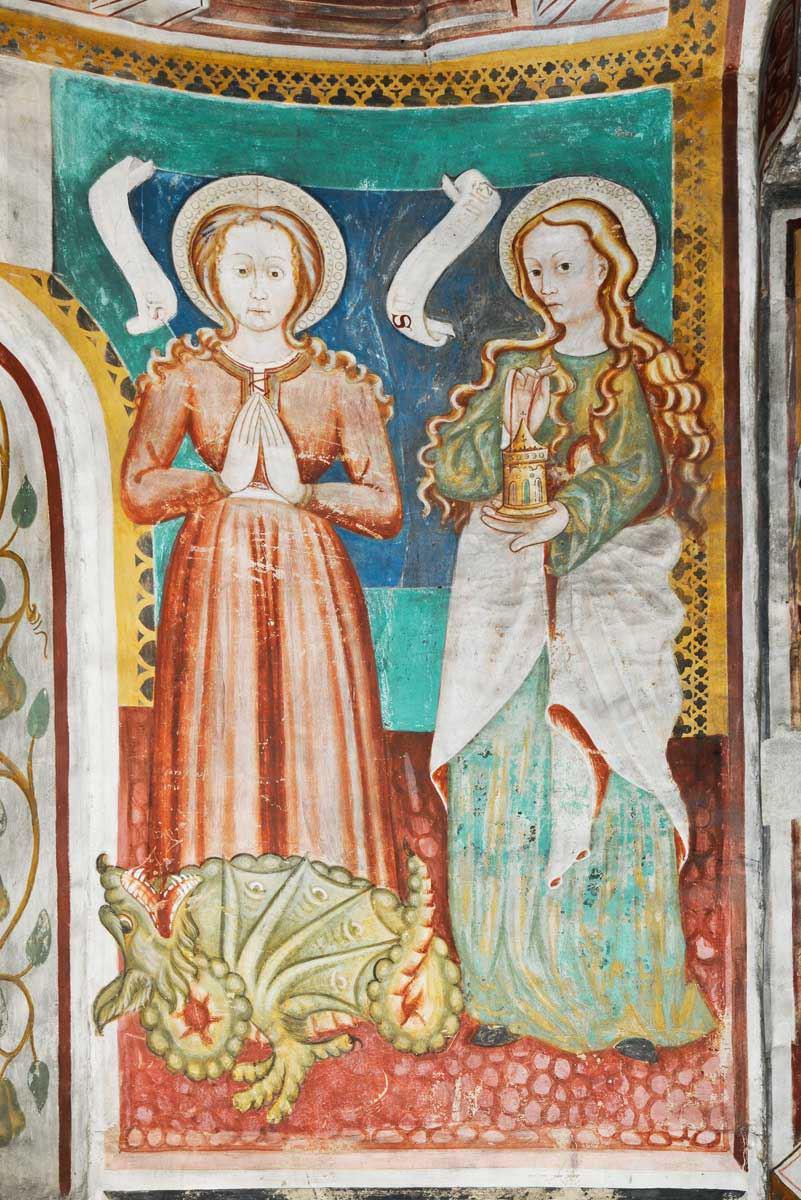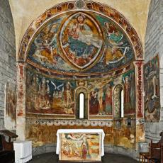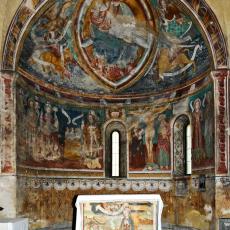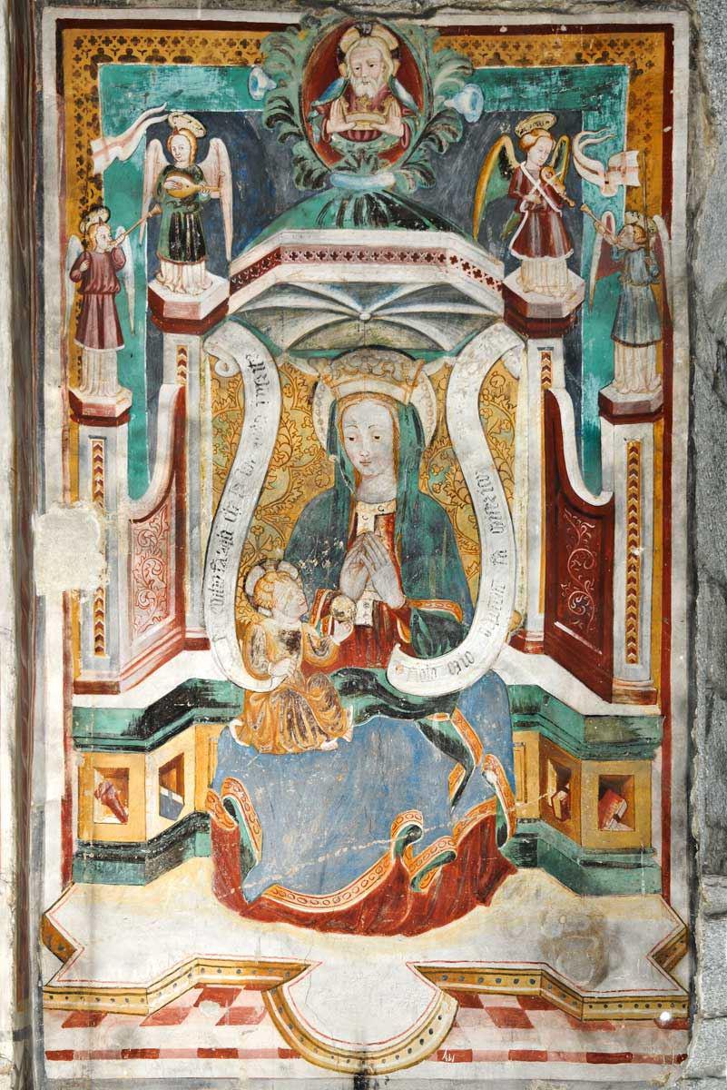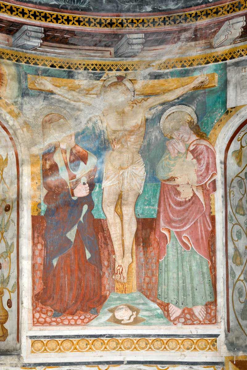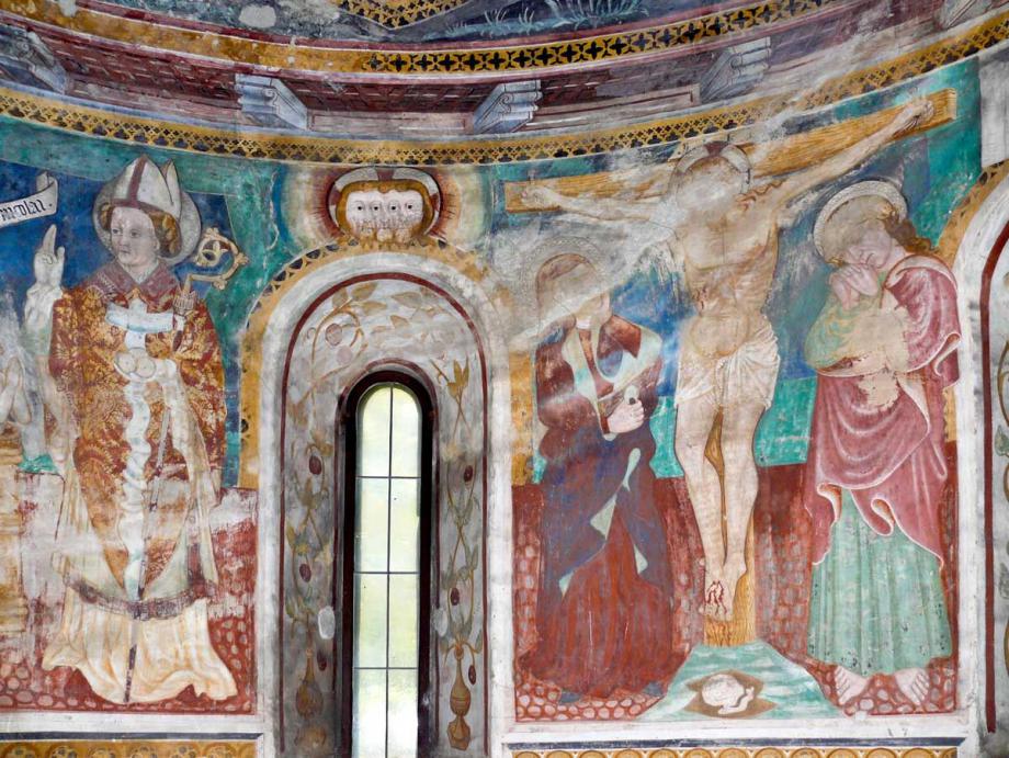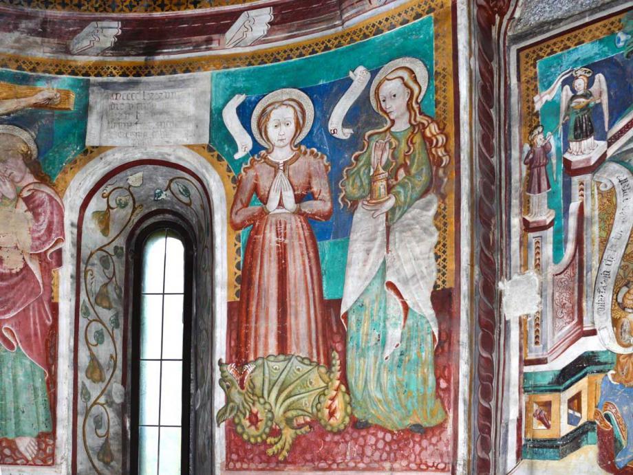 In der Gewölbedecke der Apsis haben sich spätgotische Wandmalereien von Nicolao da Seregno erhalten. Onkel und Neffe Seregno malten zwischen 1448 und 1480 nahezu in einer Monopolstellung zahlreiche Kirchen der Alpensüdtäler aus. Die Inschrift in winzigen gotischen Buchstaben oberhalb des Fensters gibt die Jahreszahl 1478 an und nennt den Maler: nicola seregnio de lug. pinsit. Die Namen der Auftraggeber stehen in einer weiteren Inschrift unterhalb des Fensters.