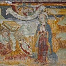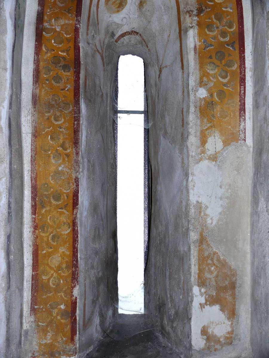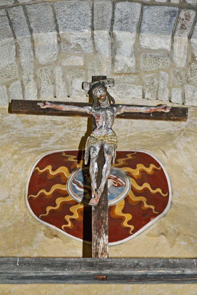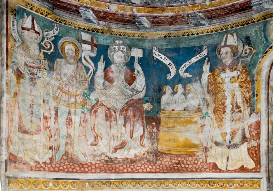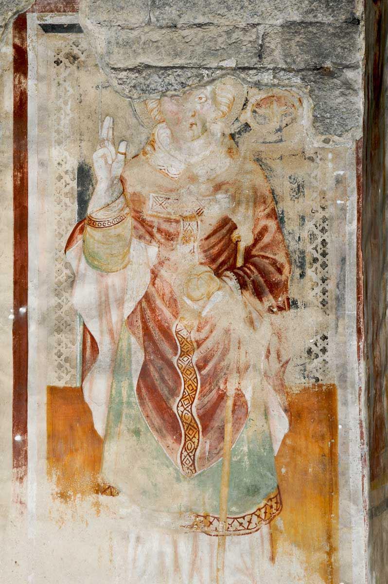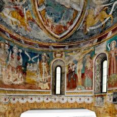 In der Gewölbedecke der Apsis haben sich spätgotische Wandmalereien von Nicolao da Seregno erhalten. Onkel und Neffe Seregno malten zwischen 1448 und 1480 nahezu in einer Monopolstellung zahlreiche Kirchen der Alpensüdtäler aus. Die Inschrift in winzigen gotischen Buchstaben oberhalb des Fensters gibt die Jahreszahl 1478 an und nennt den Maler: nicola seregnio de lug. pinsit. Die Namen der Auftraggeber stehen in einer weiteren Inschrift unterhalb des Fensters.
