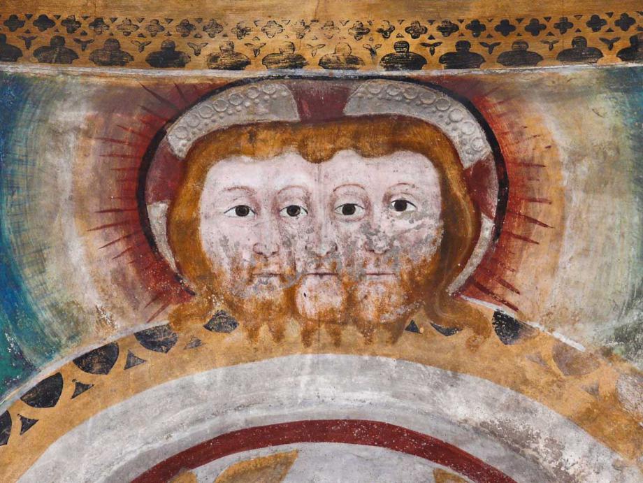 In der Kunstgeschichte sind schon zahlreiche Beispiele bei den Kelten nachweisbar und immer noch erhalten, aber auch in romanischen und hochgotischen Kapitellen (meist an der Nordseite und in inferiorer Stellung, s. z. B. den pidou berlu in der Kirche Notre-Dame in Cluny, 13. Jh.) und in mittelalterlichen Fresken (z. B. in der Kirche San Nicola (Giornico), dort mit überaus klarer Bedeutung der christlichen Trinität, 15. Jh.; ein weiterer Trifrons mit der Bedeutung der Trinität ist auch im Verkündigungsfresko von 1400 in der Peterskirche in Basel erhalten).Quelle: Wikipedia