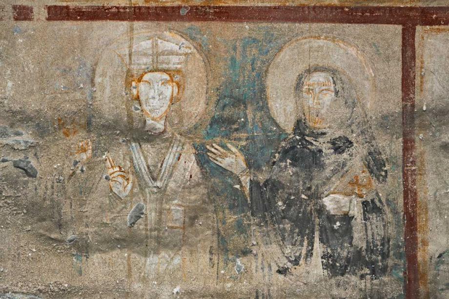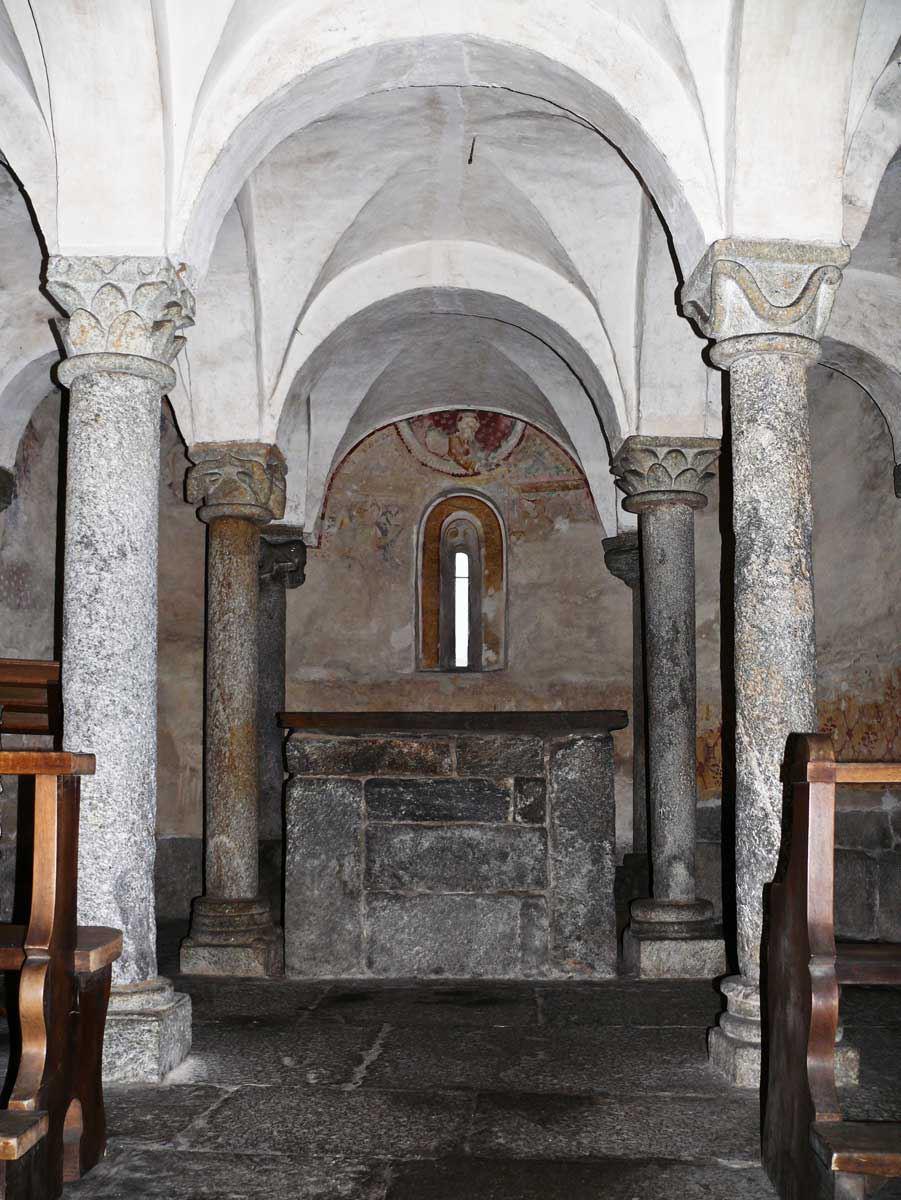 Das archaisch anmutende Kirchenschiff ist ein rechteckiger Saal, an dessen unverputzten Wänden noch Reste von Fresken zu erkennen sind. Der Boden ist mit unregelmässig verlegten Granitplatten verlegt. Auffallend sind die Anordnung von Chor und Krypta: Man kann vom Kirchenschiff aus in den Chor und die Krypta gleichzeitig sehen.