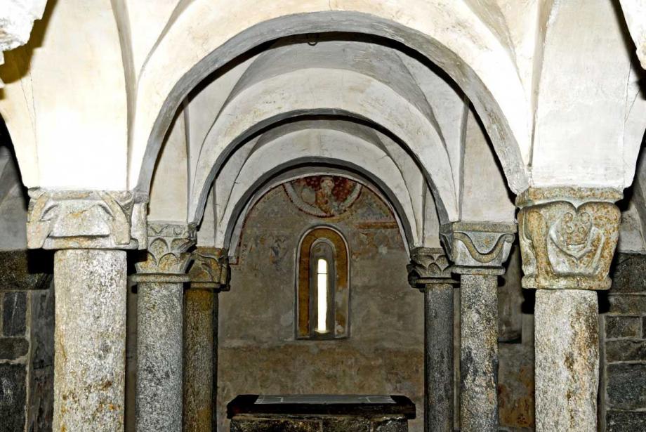 Unter dem Chor liegt die zum Kirchenschiff hin geöffnete Hallenkrypta mit dem Blockaltar aus der Entstehungszeit der Kirche. Sie ist von der Kirche durch eine Treppe zugänglich. Die drei Schiffe sind von Kreuzgratgewölben überdeckt und durch zwei Säulenreihen zu je vier Säulen voneinander getrennt. Die Kapitelle tragen Tiergestalten, pflanzliche oder geometrische Figuren.