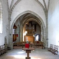 Das weithin sichtbare, altehrwürdige Gotteshaus zieht viele Besucher an. Wie staunen sie erst, wenn sie die Vorhalle durchschritten haben und die paar Stufen hinabgestiegen sind ins Dämmerlicht des weiten Schiffs! Wie strahlen da die modernen Kirchenfenster des Waadtländer Künstlers Jean Prahin! Der hohe Raum ist erfüllt von Frieden und Har- monie. Dabei ist das Baumaterial überhaupt nicht einheitlich: die einen Säulen des Kirchenschiffs sind aus hellem, kaum bearbeitetem Tuff- stein, wogegen einige andere aus grauer, mit feinen Linien verzierter Molasse bestehen. Die Bogenrundungen des Mittelschiffs sind aus Tuff, diejenigen des Chors hingegen aus Molasse.