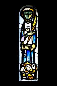 In einem schmalen Fenster über der Orgeltreppe hat Jean Prahin den heiligen Vincent dargestellt und daneben, auf der Bergseite, die vier Elemente : Erde, Wasser, Luft und Feuer, gemäß der antiken Lehre von den Grundstoffen. Diesen Fenstern entsprechen auf der Seeseite jene mit den stark stilisierten Symbolen der vier Evangelisten: der Stier des Lukas, der Löwe des Markus, der Adler des Johannes und der beflügelte Mensch des Matthäus, in feinfühligem Zusammenspiel der jeweiligen Farben. [Das Bild des Evang. Lukas fehlt unten, da die neue Orgelempore es verdeckt].