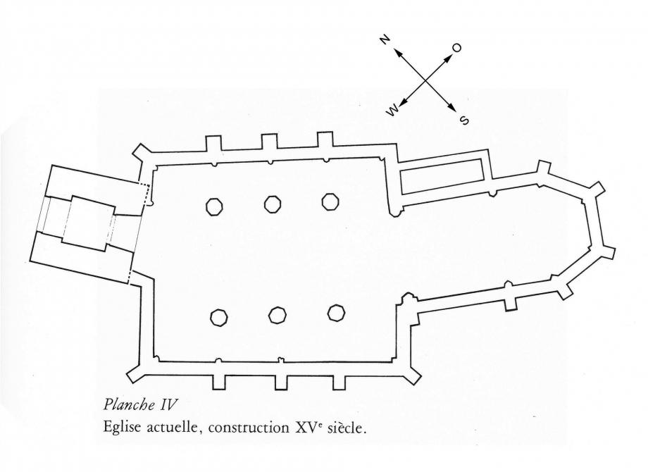 Nach dem Turm folgte der dreizehn Meter lange Chor mit seiner viel- eckigen Grundfläche. Der Bau des Kirchenschiffes erlitt eine starke Verzögerung durch die Unruhen und Plünderungen im ausgehenden XV. Jahrhundert im Zusammenhang mit den Burgunderkriegen, in welchen das savoyardische Montreux zu den Besiegten gehörte. Doch hinderte dieser Aufschub die Baumeister keineswegs daran, ihr Werk weiterzuführen und den sehr harmonischen, dreischiffigen Bau zu voll- enden. Dabei hatten die voneinander abweichenden Ausrichtungen von Vorbau, Schiff und Chor schweres Kopfzerbrechen verursacht; ohne Zweifel mußte man sich der Form des Felsvorsprungs und der Beschaffenheit des Gesteins anpassen.
