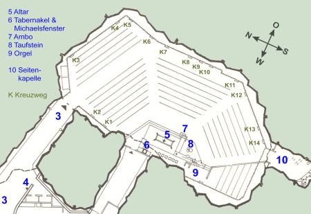 1979 erschien eine kleine Broschüre, herausgegeben von der Pfarrei, woraus nachfolgend - mit freundlicher Genehmigung - die Gedanken des Präsidenten der Baukommission Imboden und des Architekten Donat Ruff wiedergegeben sind. Der Grundriss ist ebenfalls dieser Broschüre entnommen und weiter bearbeitet.
