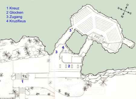 b) durch das Versetzen der Kirche in den Felsen könnte viel Platz und Boden gespart werden, der dann als Parkplatz und eventuell Friedhof zur Verfügung stünde,